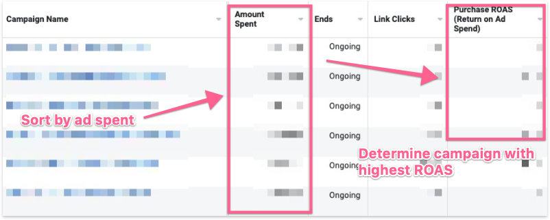 Review current Ad Spend distribution by sorting the campaigns by “Amount Spent” and identify the high-spending campaigns along with their return on ad spend (ROAS) or Cost per Action (CPA).