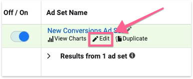 Hover over the ad set name and click “Edit”