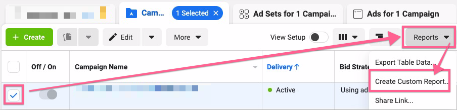 Select the campaign, click “Reports”, and click “Create Custom Report”.