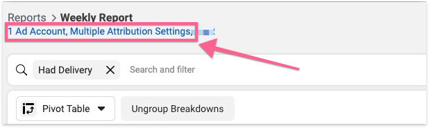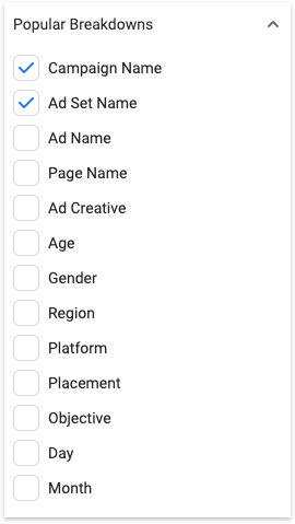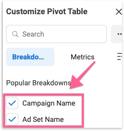 In the “Customize Pivot Table” sidebar (right hand side), select “Campaign Name” and “Ad Set Name”.