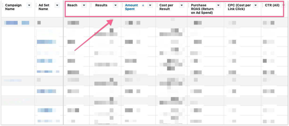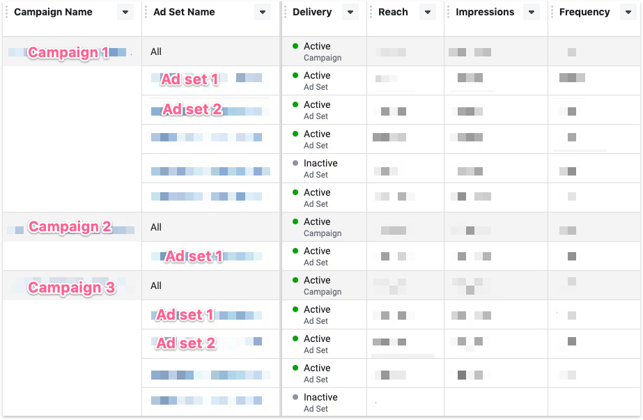 This will give you the ad campaign data grouped by “Campaign Name” and “Ad Set Name”.