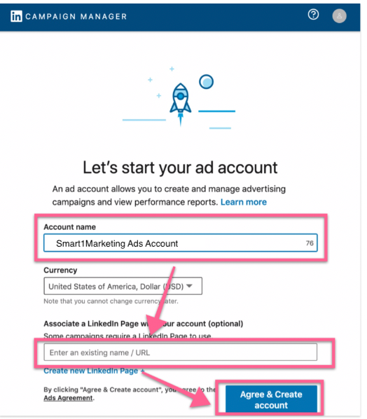 Add an ad account name and optionally link your existing LinkedIn page if you have one. Then click “Agree & Create Account”. You will then be redirected to the campaign setup dashboard.