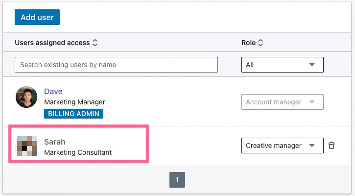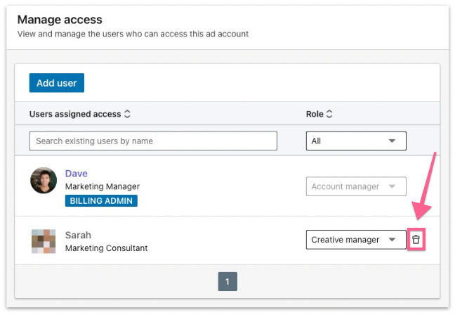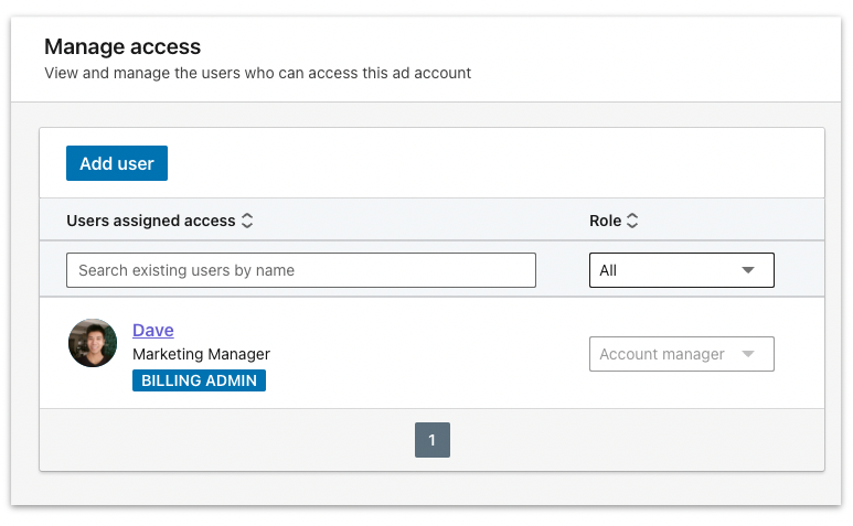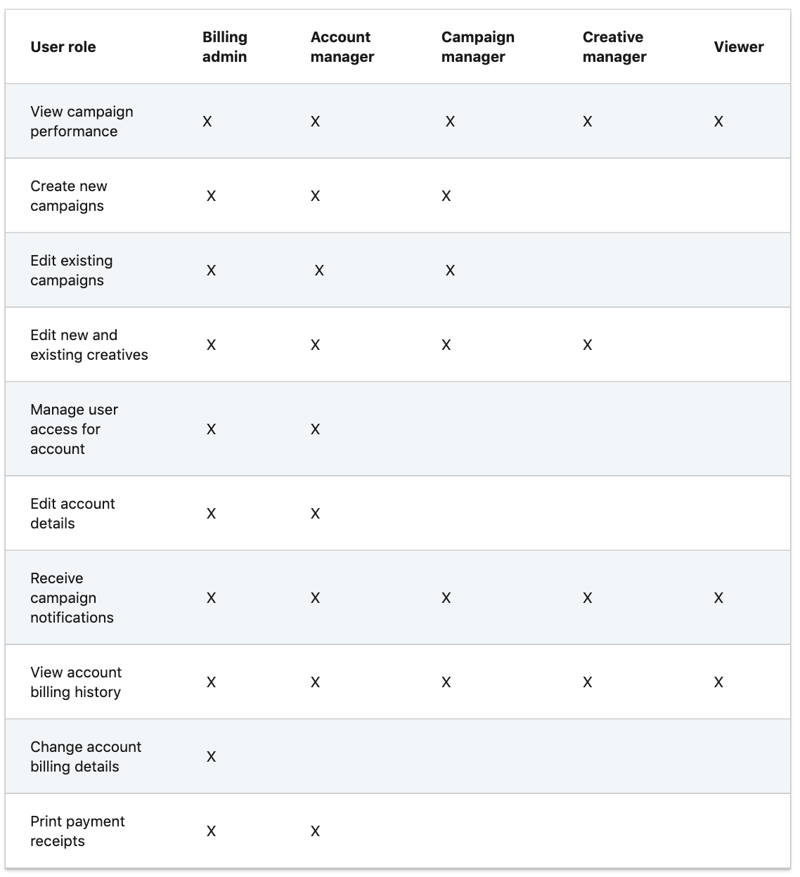 To determine which appropriate user role to assign, refer to user roles in LinkedIn campaign manager.