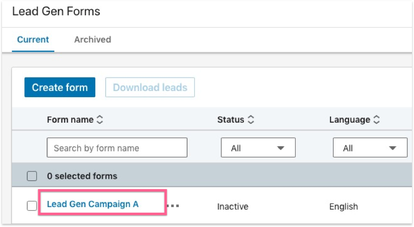 Click “Create form” in the Lead Gen Forms dashboard.
