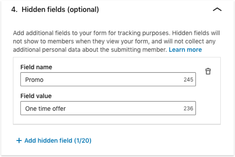 In the last section (optional), you can add additional fields (up to 20) to your form for tracking purposes. For example, you can add “Promo = One time offer” to track this specific campaign.