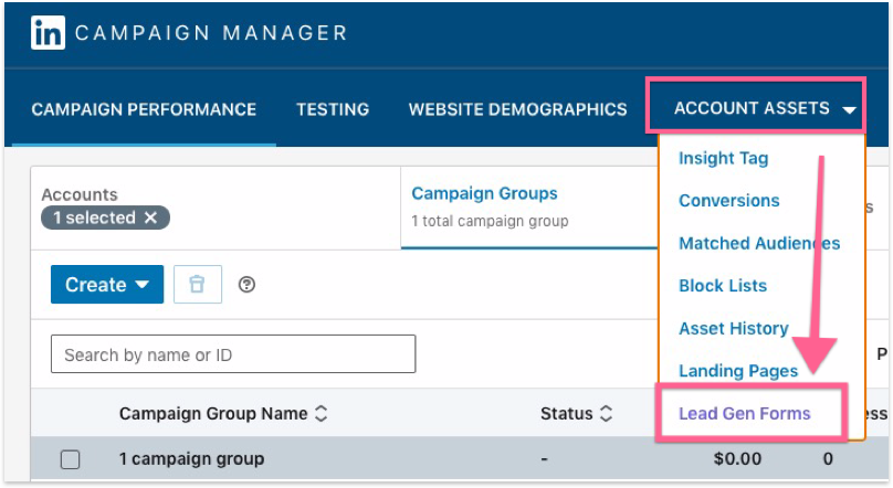 Click the Account Assets dropdown and select “Lead Gen Forms”.