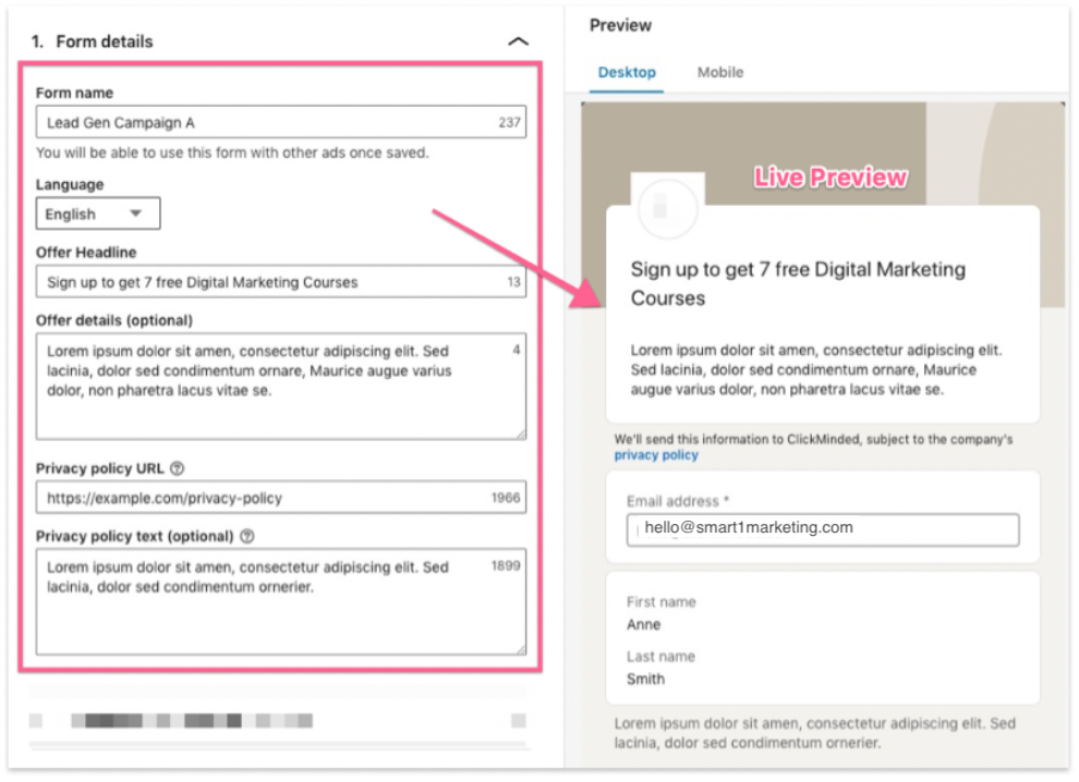 In the first section, add the Form name, Language, Offer Headline, Offer details, Privacy policy URL, and Privacy policy text.