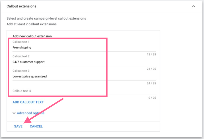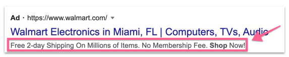 Callout extensions are snippets of text below your ad where you can promote unique offers to shoppers, like free shipping or 24-hour customer service.
