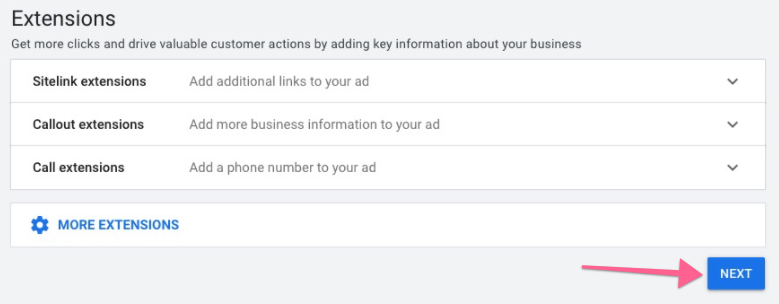 Next, Add Ad extensions to increase the click-through rate of your ads.