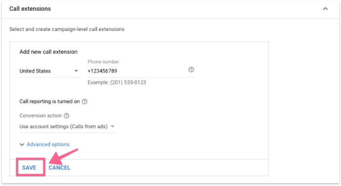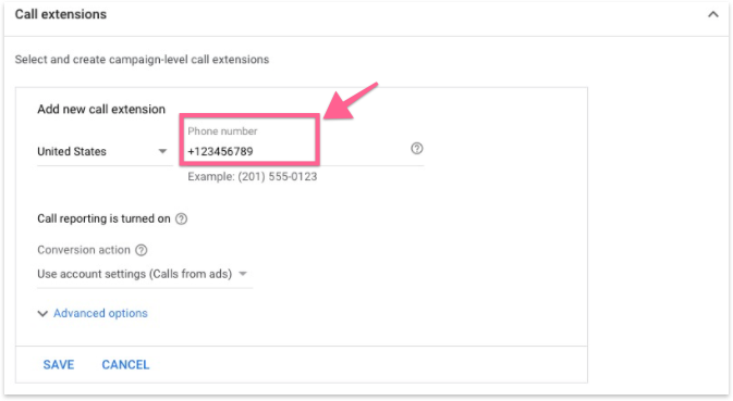 (Optional) Call extensions let you add phone numbers to your ads. Recommended if you have a contact number dedicated to customer support or sales.