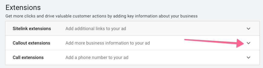 Add Callout extensions. Click the down arrow next to “Callout Extensions”.