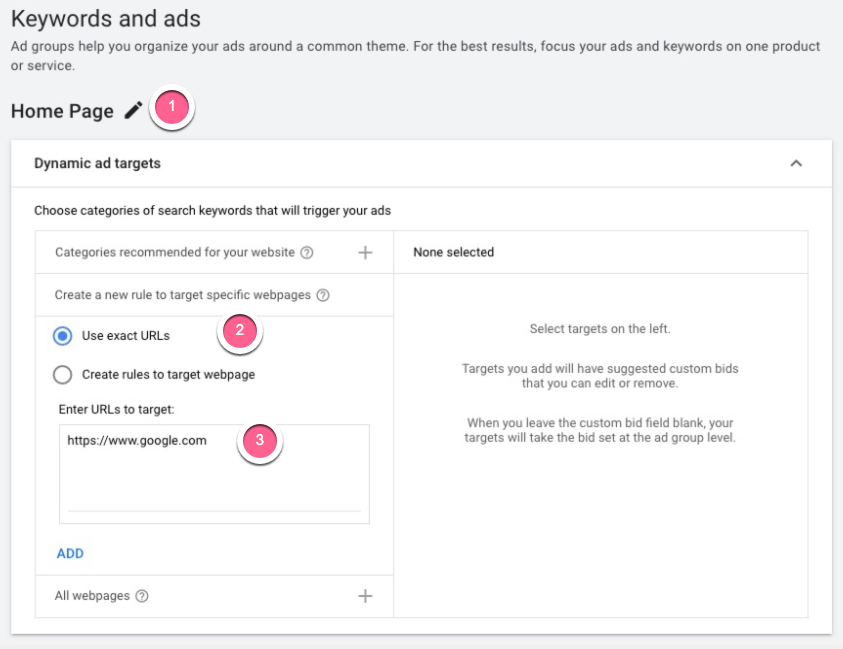 Note: It’s recommended to create ad groups for different theme/category of pages for your website. For example, if you’re running an electronics e-commerce store, you want to create one ad group for your home page and one ad group for each of your product category pages such as TVs (/televisions) or Digital Cameras (/digital cameras).