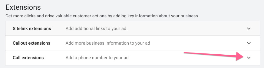 Add Call extensions. Click the down arrow next to “Call Extensions”.