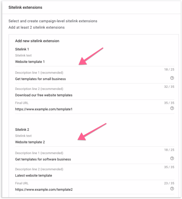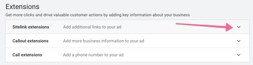 Add site link extensions. Click the down arrow next to “Sitelink Extensions”.