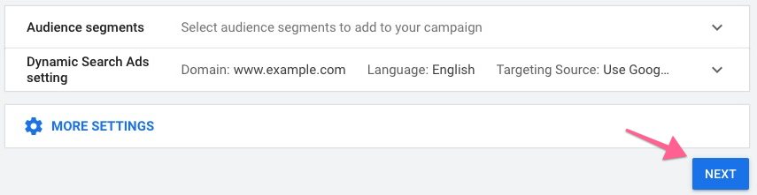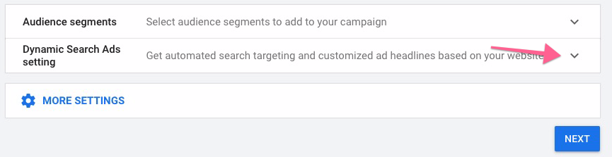 Note: If you don’t see the Dynamic Search Ads setting, click “More Settings” instead and you will find the Dynamic Search Ads setting in here.