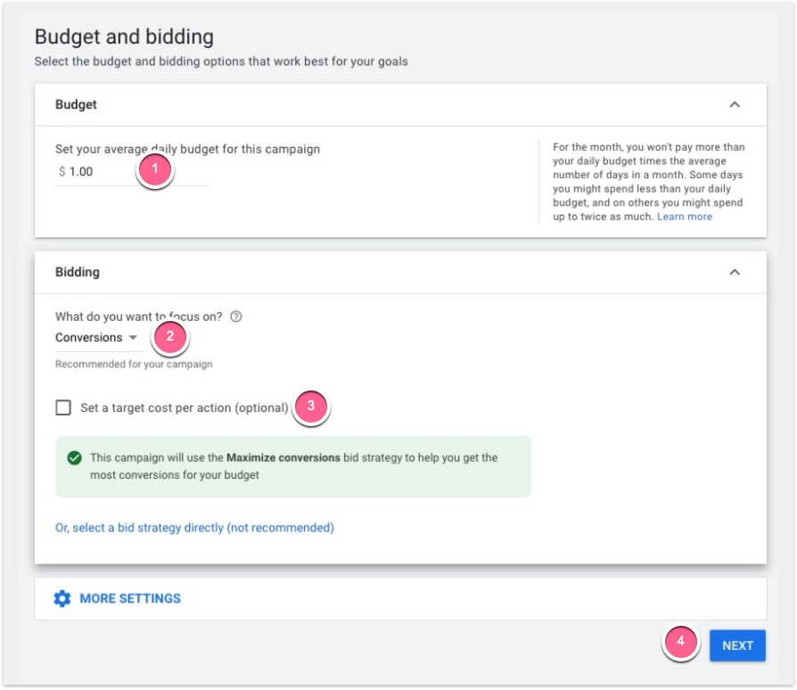 Set the bidding focus to Conversions (recommended).
