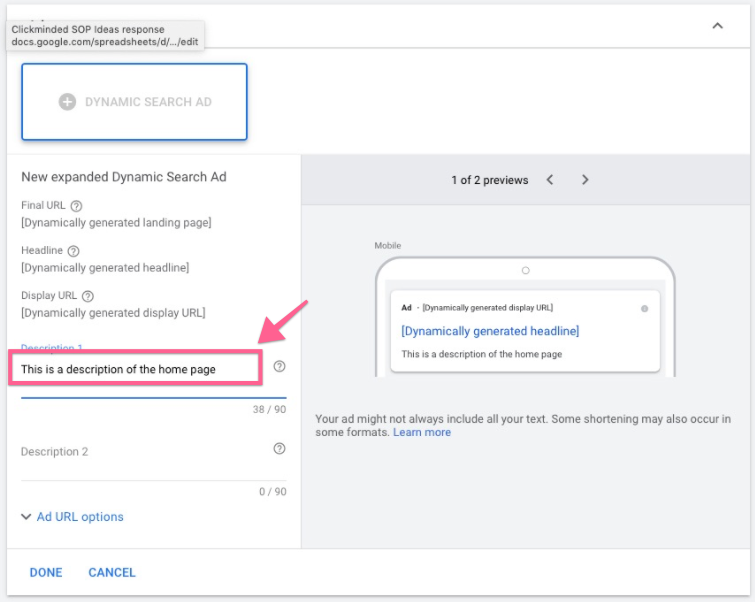 Next you will create the dynamic search ad. Here, the URL, headline, and display URL will automatically be generated. All you have to write is the description that will show when Google presents this dynamic search ad to the user.