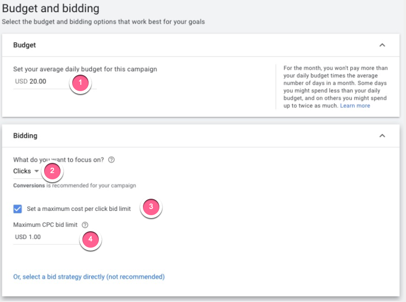 Bid Focus — Set the bid focus to “Clicks”. This sets the bidding strategy to “Maximize clicks”, which allows Google Ads to automatically set your bids to help get as many clicks as possible within your budget.