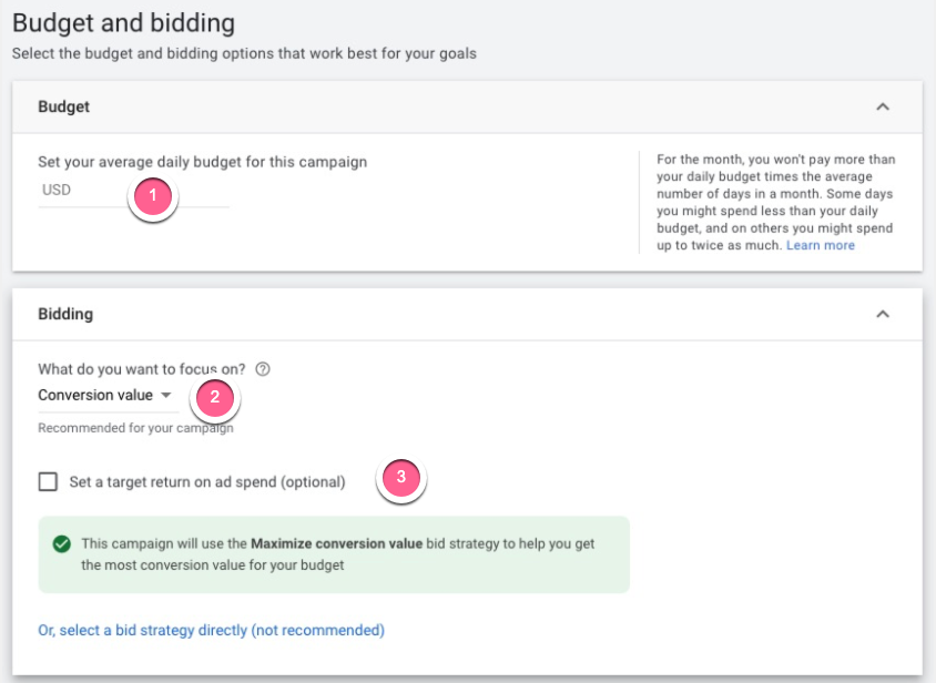 Bid Focus — Set the bid focus to “Conversion value”. This sets the bidding strategy to “Maximize Conversion Value”, which allows Google Ads to automatically set your bids to help you get the most conversion value within your budget.