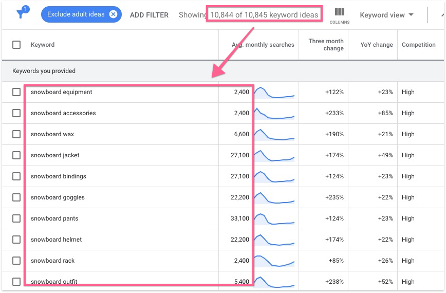 Here you will see a list of keyword ideas available (ranked by relevance) based on the keywords you entered earlier.