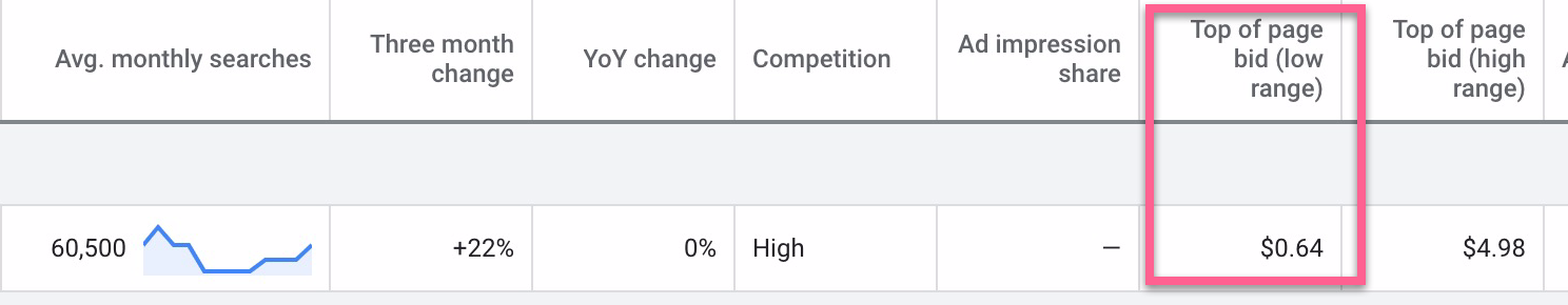 Look for the metric “Top of page bid (Low range)”. This is the minimum cost per click (CPC) other advertisers bid for the keyword to appear at the top of the page.
