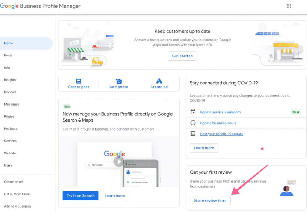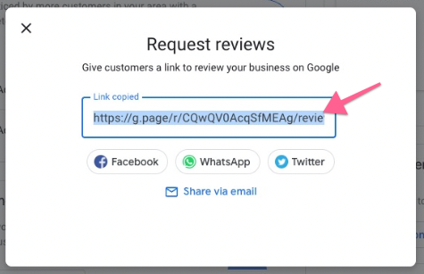 Click “Share review form” under “Get your first review”. If you have existing reviews then the form should be located under “Get more reviews”.