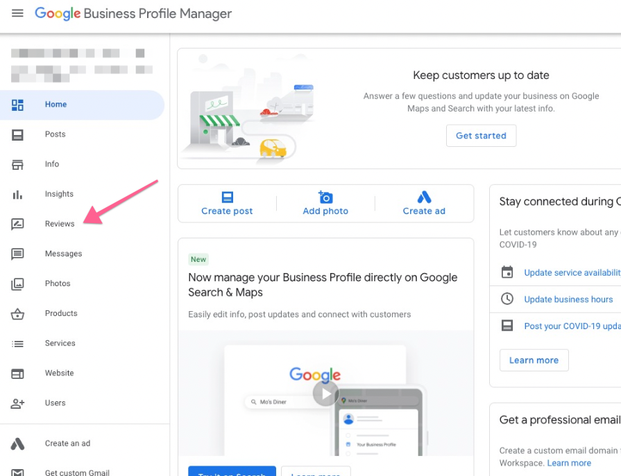 To check a customer review, login to your Google Business Profile dashboard, and click “Reviews”.