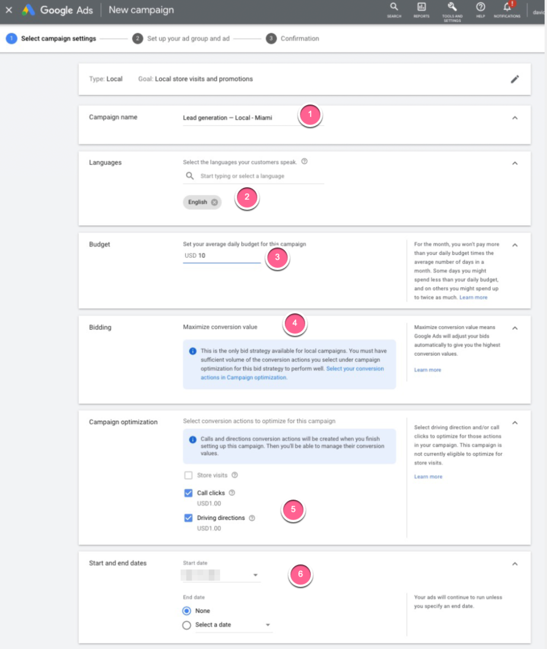 Bidding — The only bidding option available for local campaigns is Maximize conversion value. This bidding will maximize the local actions such as store visits or calls.