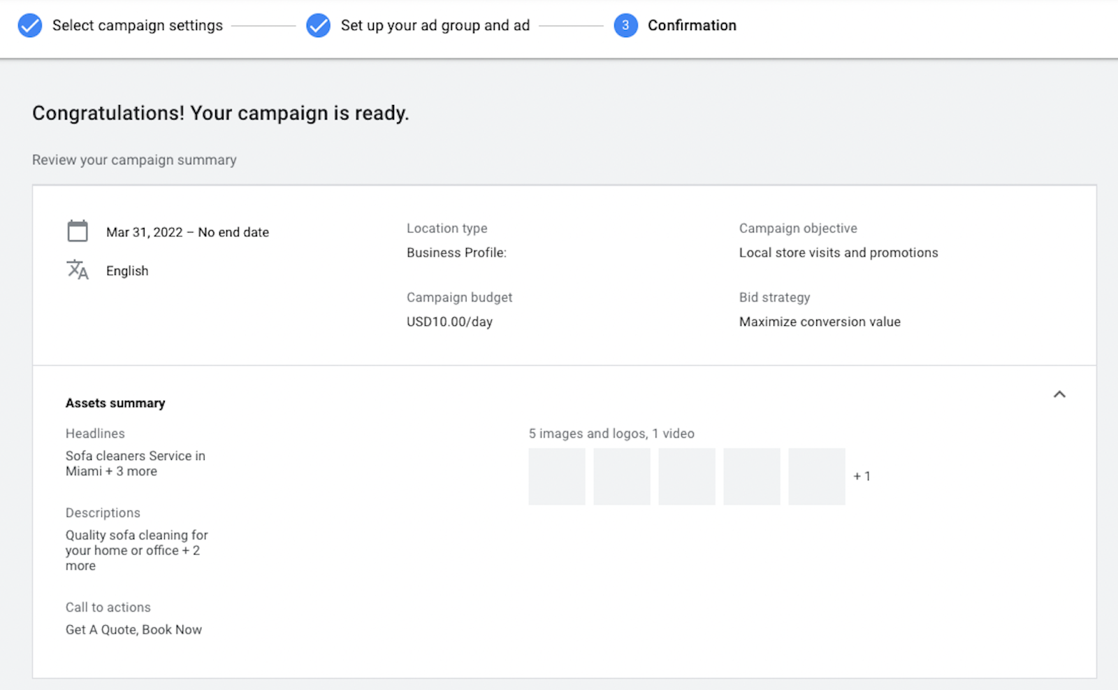 You can now view a summary of your campaign. Your local ad campaign is now ready!