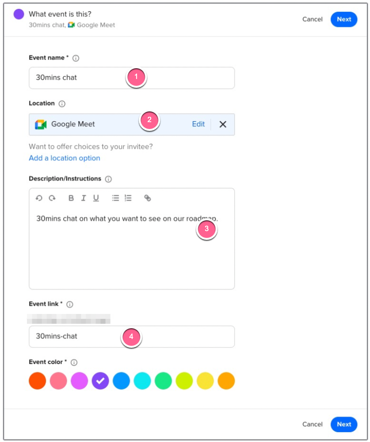 Event link — The URL that you’re going to share with your customers. A short URL is recommended for ease of sharing.