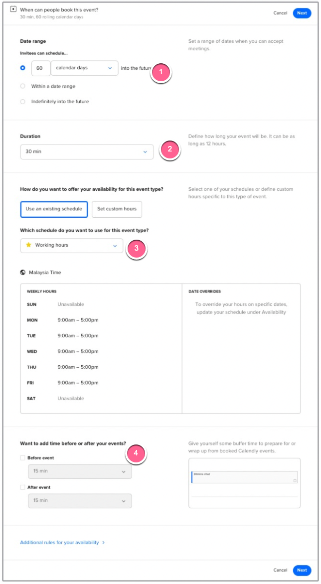 Set the time, date and duration of when the customers can schedule a meeting with you.