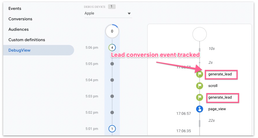 If the lead tracking is successful, you should see the lead conversion event in DebugView.