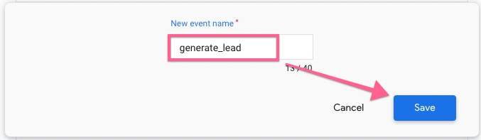 Custom event name — Use one of Google’s recommended event names for lead generation, in this case, it’s “generate_lead”.