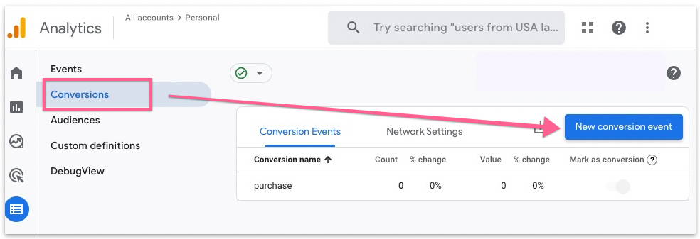 Head to the “Conversion” tab and click “New conversion event”.