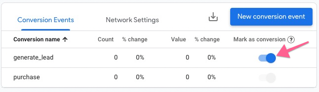 Make sure the “generate_lead” event is marked as conversion so it will show up in the conversion report when it starts recording.