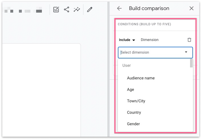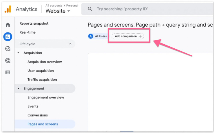 Following the steps in Create a landing page data report in Google Analytics 4. You have now created the landing page report. Let’s segment this data by traffic sources (Example: organic, referral, paid, etc) by clicking “Add comparison”.