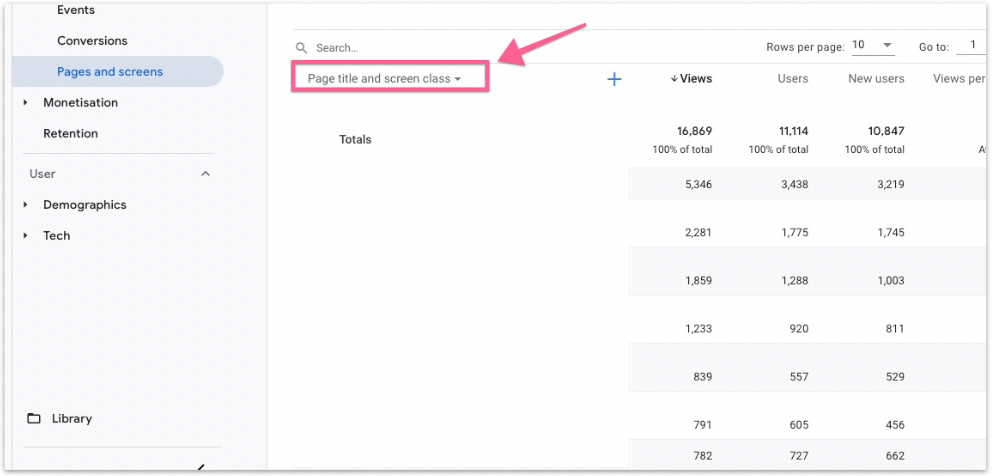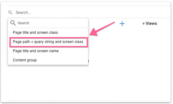 By default, the page traffic is sorted by page title, click on the “Page title and screen class” and select “Page path + query string and screen class”.