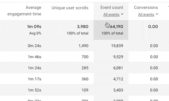 At this point, the report is showing the session data for all pages. In order to view the landing page data, change the Event count from “All Events” to “session_start”. This will filter the pages when the users first started the session (the landing page).