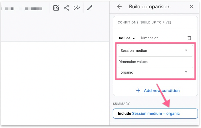 In this example, we’ll be filtering the landing page session that comes via organic search. To do this, include “Session medium” and set the “dimension value to “organic”. You will see a summary of the filter at the bottom of the filter.