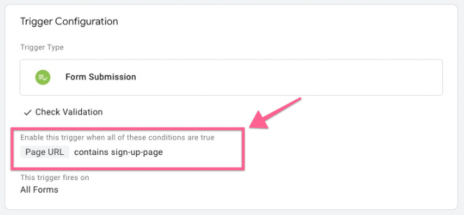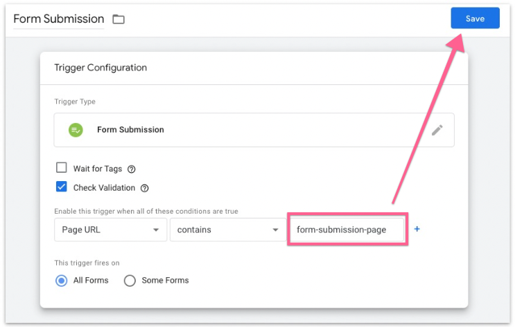 Make sure the URL is the correct URL. When a user submits a form on this page, you want to trigger the event “form_submission” and send it to Google Analytics. Once done, click “Save”.