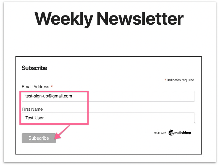 We can now start testing if the form submission event works. Head over to your website where the sign-up form is located. This should be the same page that you defined in step 11 of Set up a new custom event in Google Tag Manager.