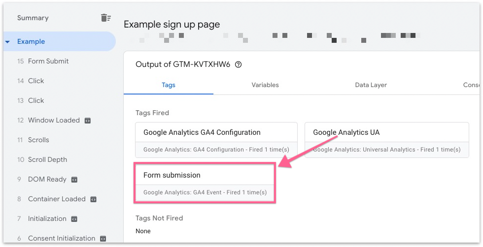 Back in the Tag Assistant tab, you should see the list of events triggered on the sidebar. If you see the “Form submission” event that you set up earlier, then that confirms that the form submission event is firing correctly.