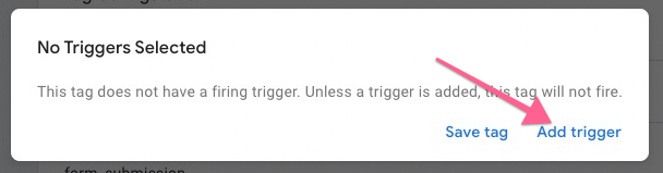 Adding a trigger informs Google Tag Manager when it should fire this event. Since this is a form submission event, it should fire when someone submits a form. Select Form Submission from the list of triggers.