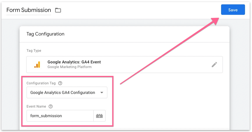 Next, select the Google Analytics 4 configuration tag and name this event, then click “Save”. This event name will appear (and be used) in Google Analytics so it should help you identify which form the user is submitting. If you have multiple forms, it’s recommended that you use a unique event name to help you identify them.