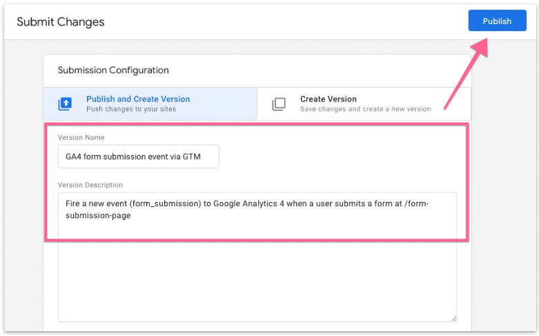Add a name and description to this Google Tag Manager changes and click “Publish”.
