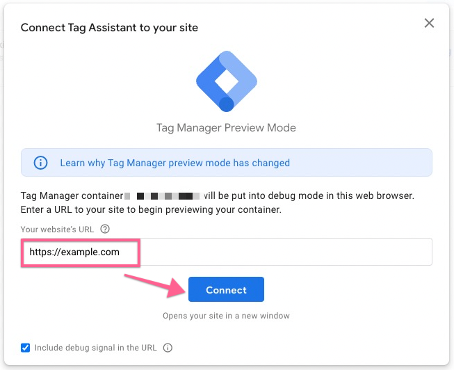 A new window (Tag Assistant) will launch. Add the URL of your website where the Google Tag Manager and the custom event were implemented and click “Connect”.