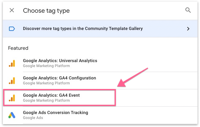 Select “Google Analytics: GA4 Event” from the list of tag types.