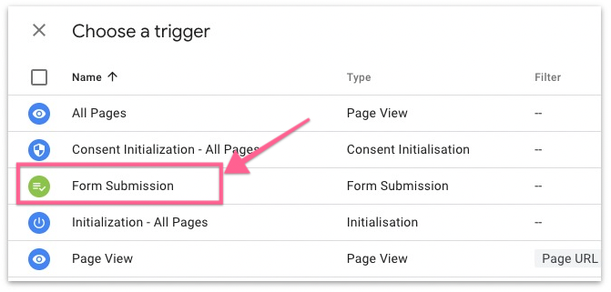 Important: Google’s Form Submission Trigger only works for standard submit events. If you’re using a custom form solution, be sure to check with your developer or email marketing platform’s official documentation.
