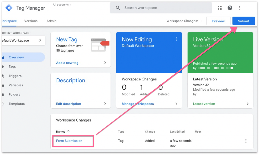 You should see the new tag in the dashboard. Click “Submit”.