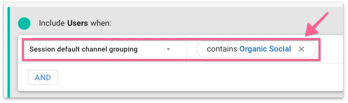 If you want to create a segment (report) for SOCIAL MEDIA traffic, select “Session Default Channel Grouping” from the condition filter and set the value to Contain “Organic Social”.